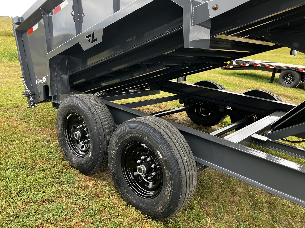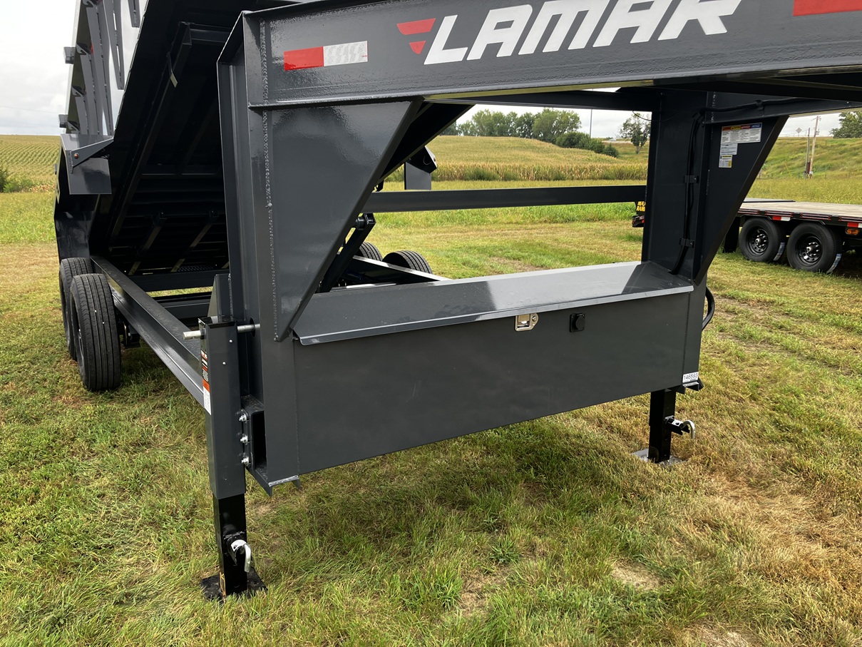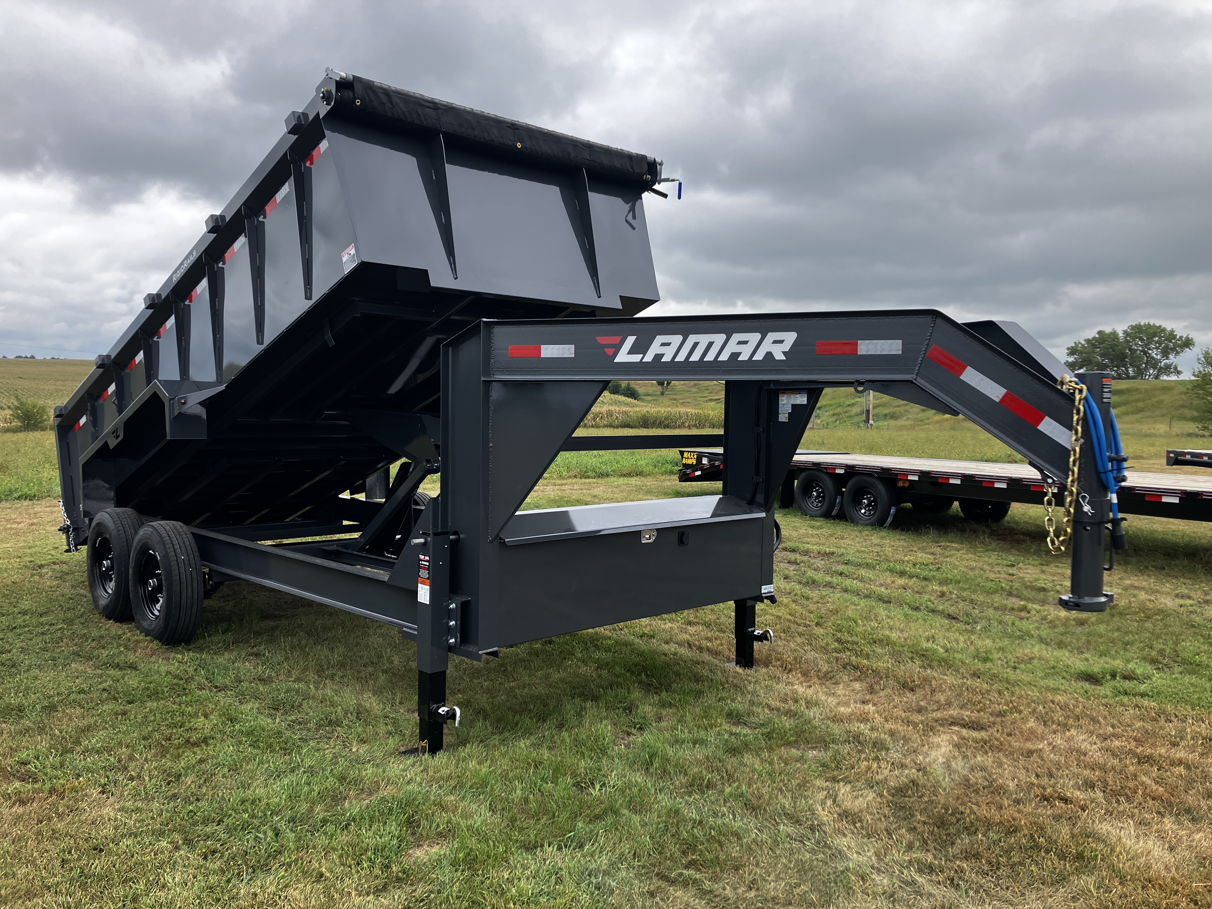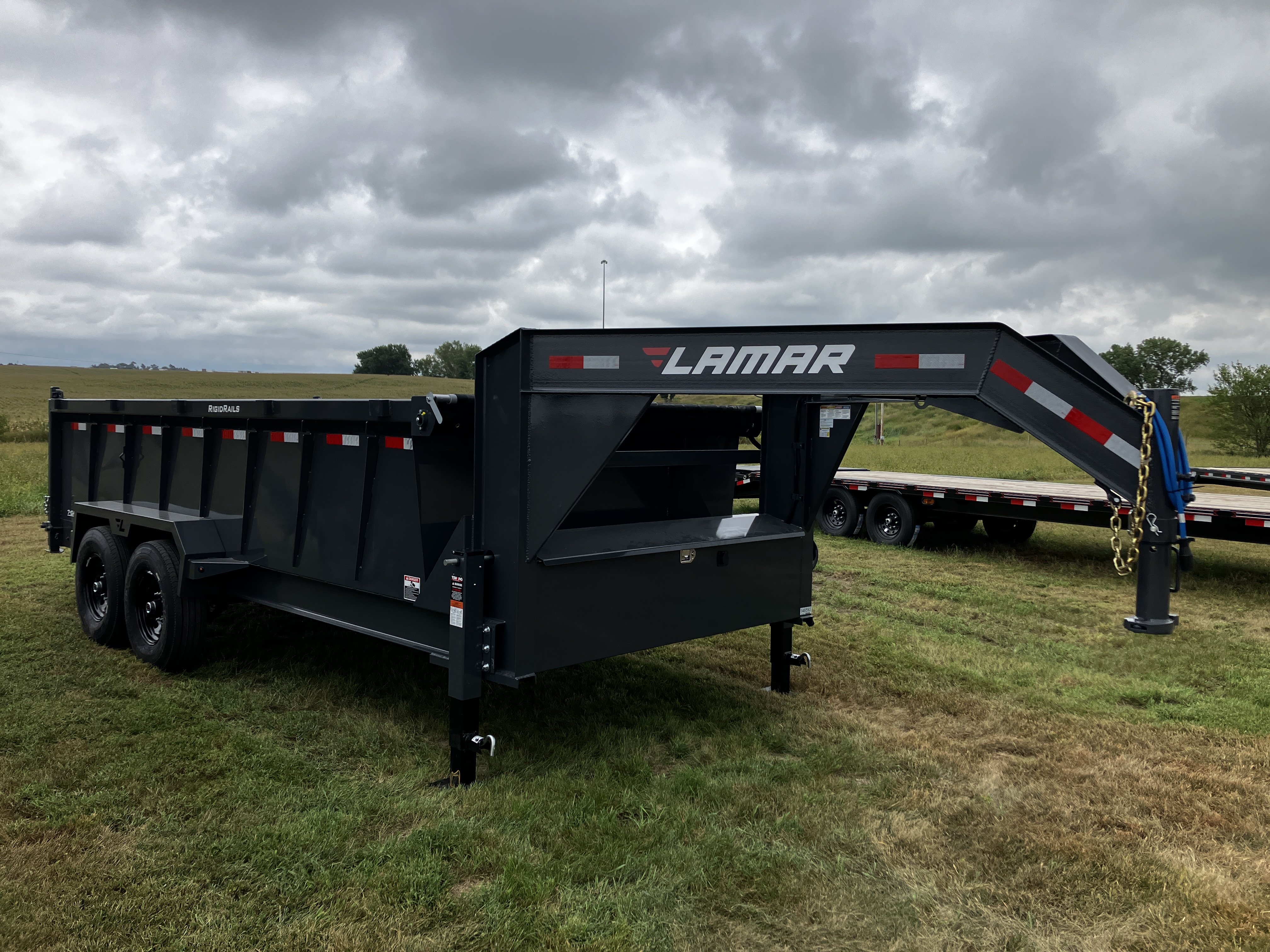 Brand New - In stock - 2025 Lamar Trailers - 16' x 83" DL Low-Pro Gooseneck Dump Trailer - 7,000# Lippert Ez-Lube Electric Brake Drop Spring Axles - 10" 13LB I-Beam Neck - 8" 13lb I-Beam Frame - 7 Gauge Floor - 36" 10 Gauge sides - 7 Gauge Rigid Rails - Black Mod Wheels - 14 PLY Radial Tires - Spare Tire Mount - Matching Spare Included - Dual 10k Drop Leg Jacks - Oversized Lockable Front Toolbox -Solar Charger - Power Up/Power Down/Gravity Down Remote w/10ft Cord - Tuff Wireless Remote Control - Heavy Duty Slide in Ramps - Rear Loading Support Stands - Dual Action Rear Gate(Spreader Gate & Barn Door Combo) - 2-5/16" 30k Adjustable Gooseneck Coupler -Lifetime LED Lights - Arctic Wiring Harness - Low Profile Tarp Kit - Lamar Gray Premium Powdercoat - 3 Year Structural Warranty - Financing Available