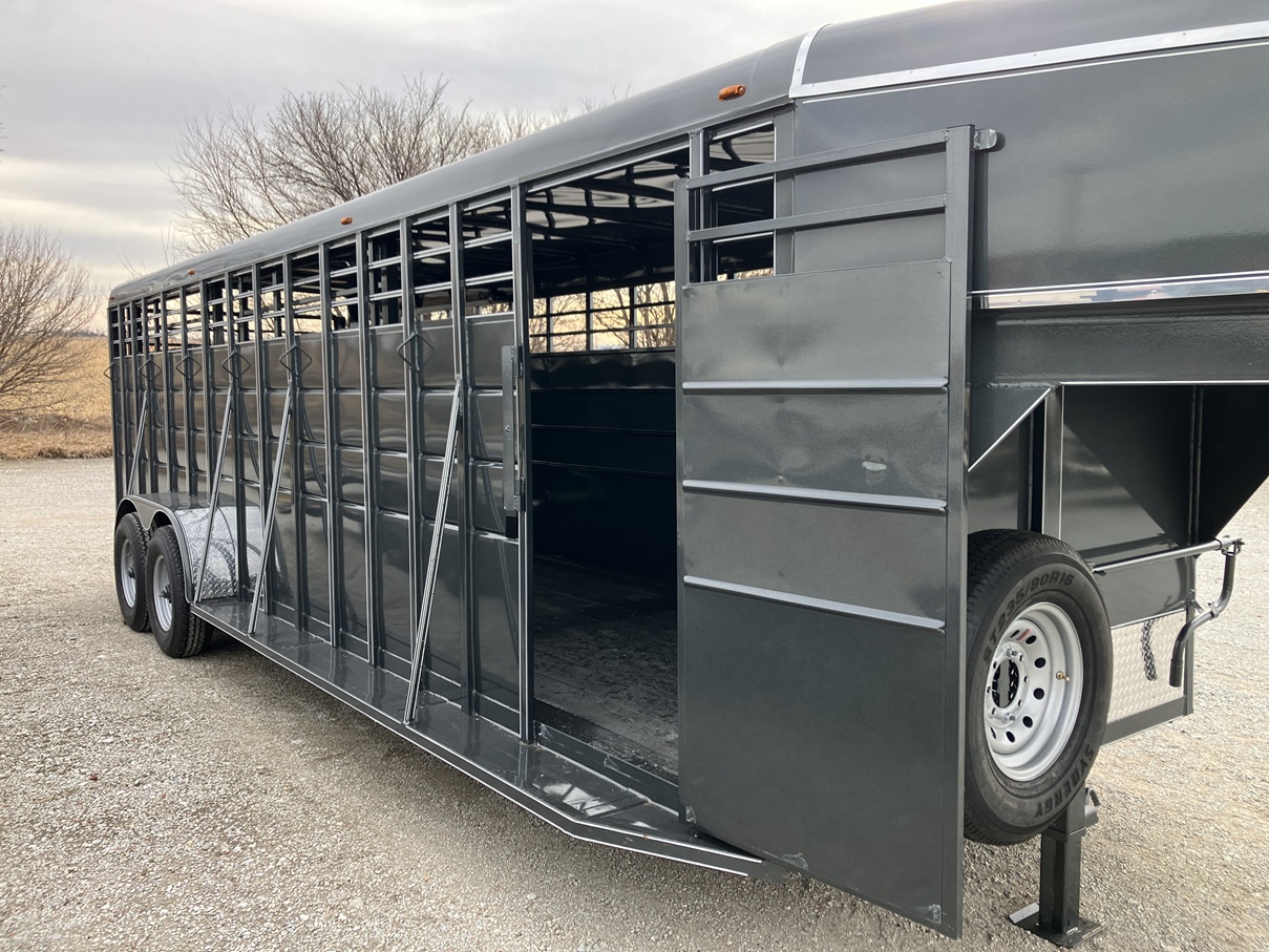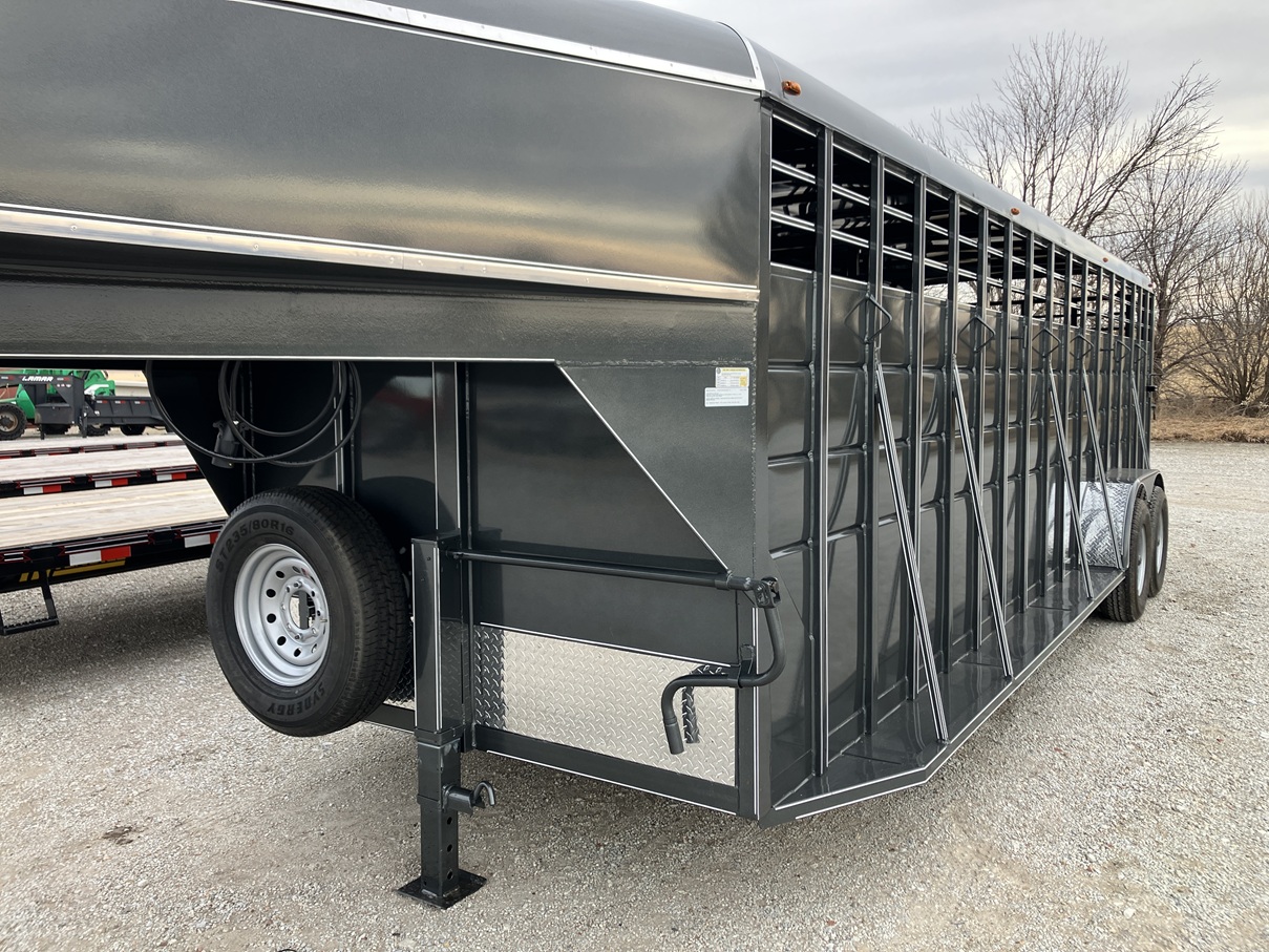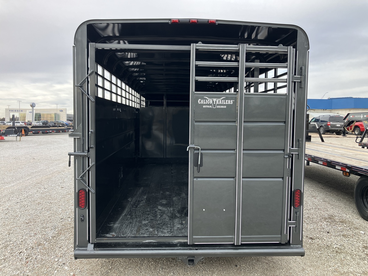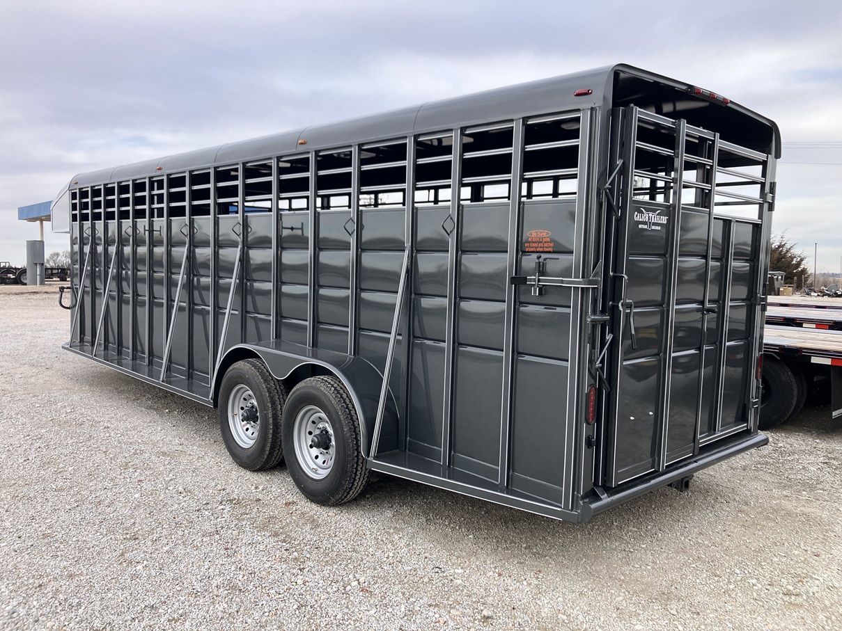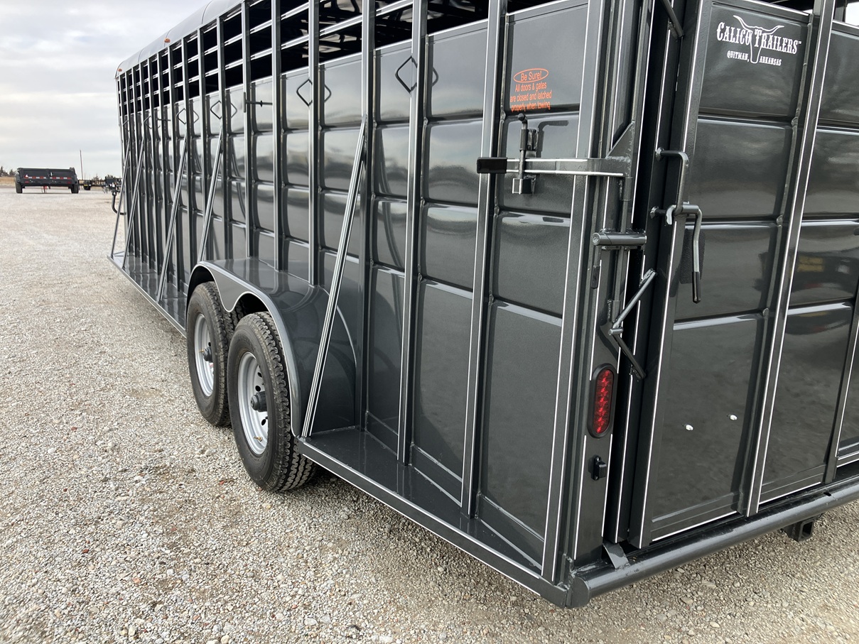 On Order - 2026 Calico Trailer MFG - 24' Gooseneck Stock Trailer - 6'8" Wide - 6'6" Tall - 7,000# Dexter Torflex Torsion Axles - Electric Brakes on Both Axles - Break Away Kit - Safety Cables - 10 Ply Radial Tires - Silver Mod Wheels - Spare Mount - Spare Included - Maxwell Aerodynamic Nose - Bull Package - 16" OC Wall and Floor Supports - LED Lights - 2-5/16" Adjustable Gooseneck Coupler - 2 Cut Gates - Full Swing Slider Rear Gate w/Locking Bull Bar - Slam Latches on All Gates - Lay Down Gate in Neck - Tie Rings- Gravel Guards in Front and over Fenders - Full Length Running Boards - Lengthways Treated Flooring - 1 Year Warranty