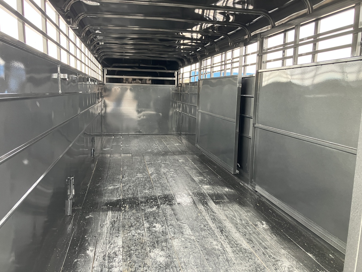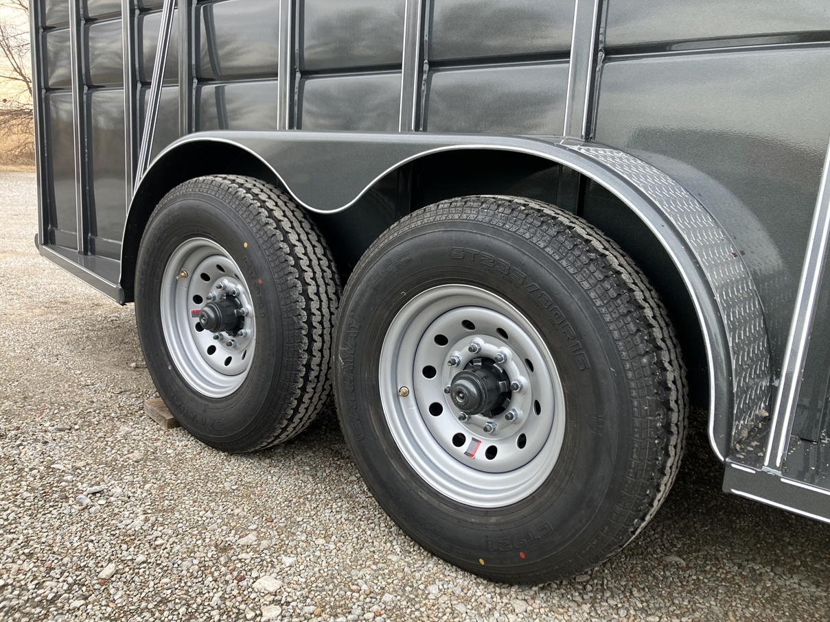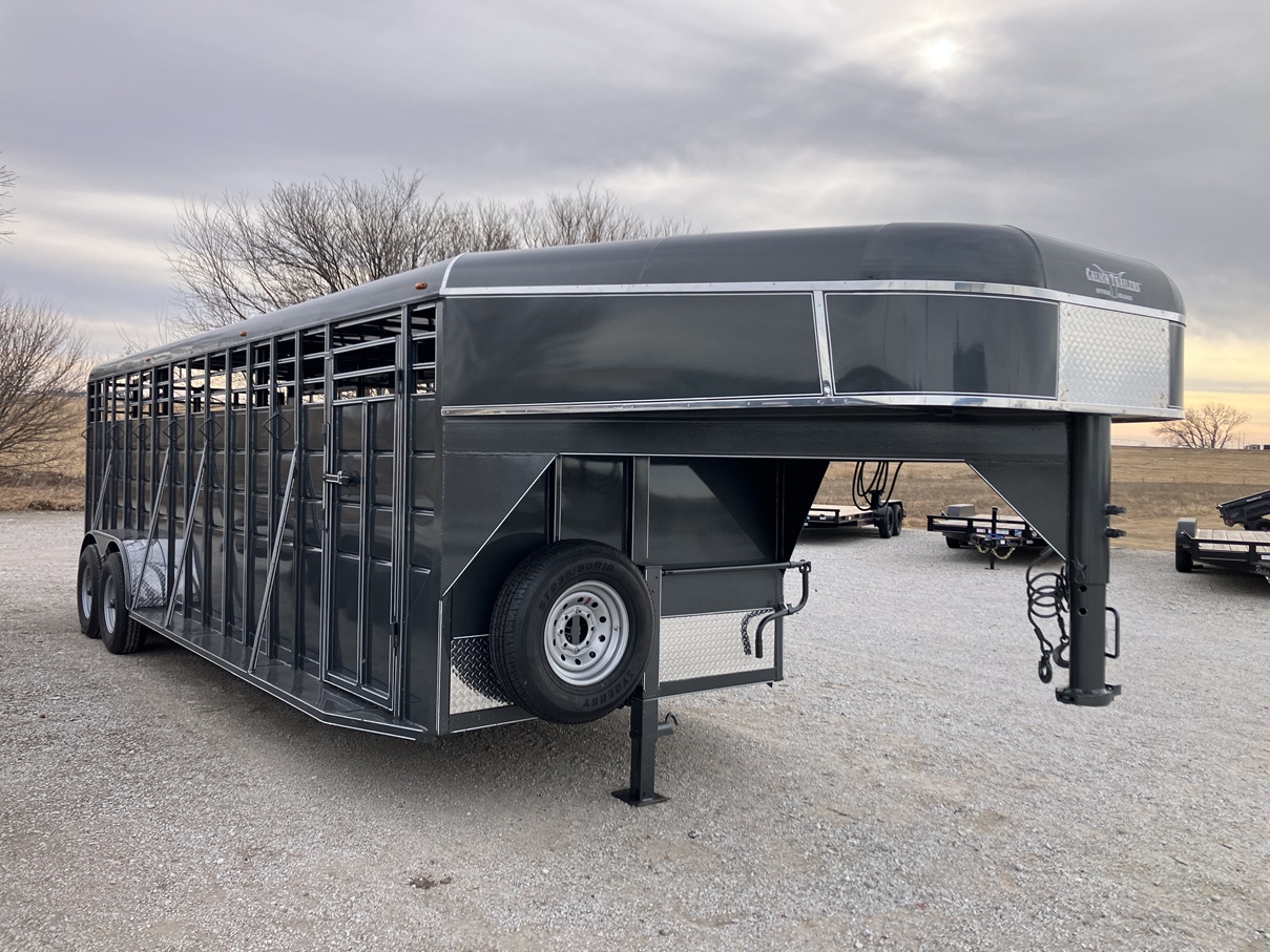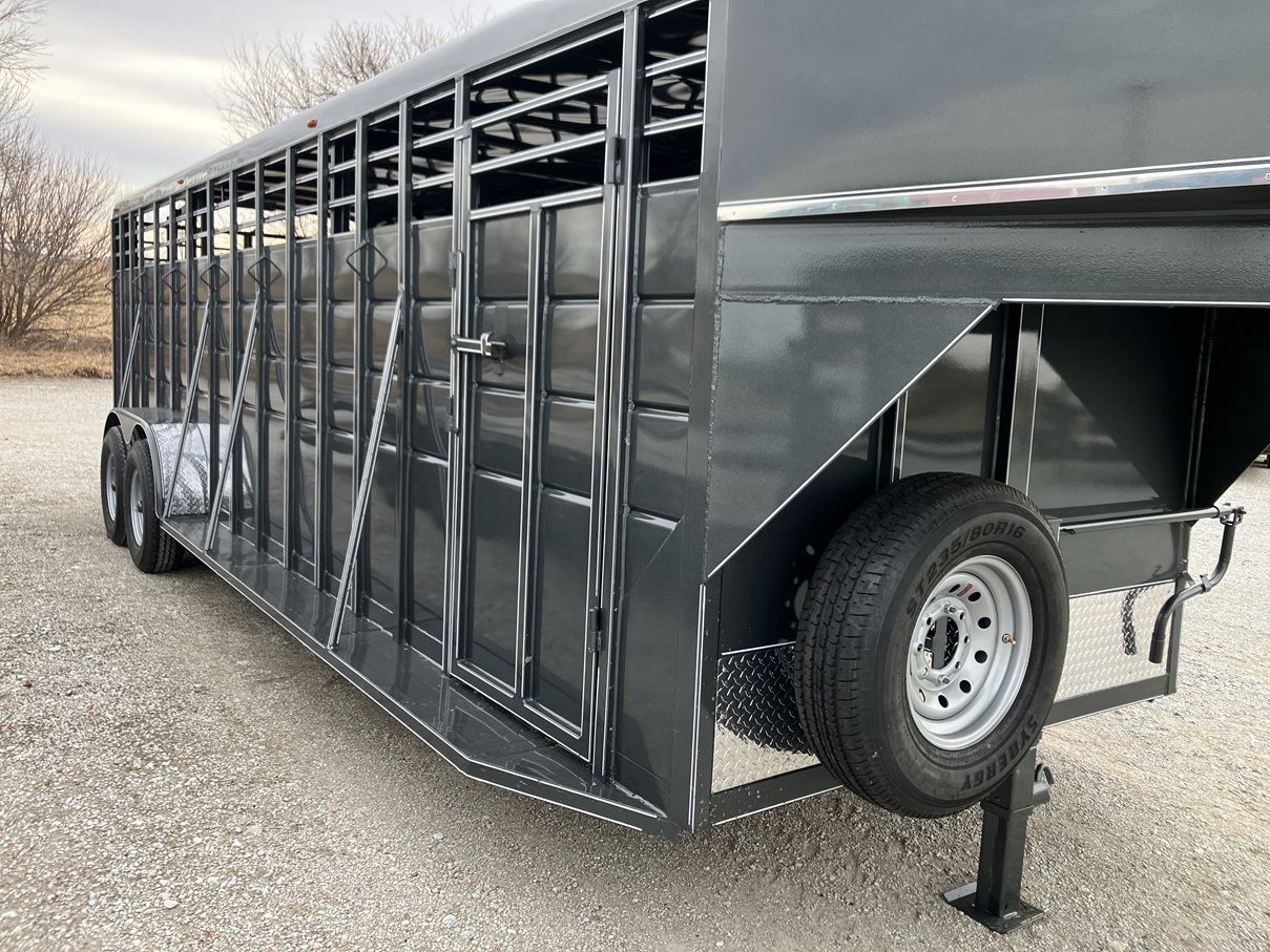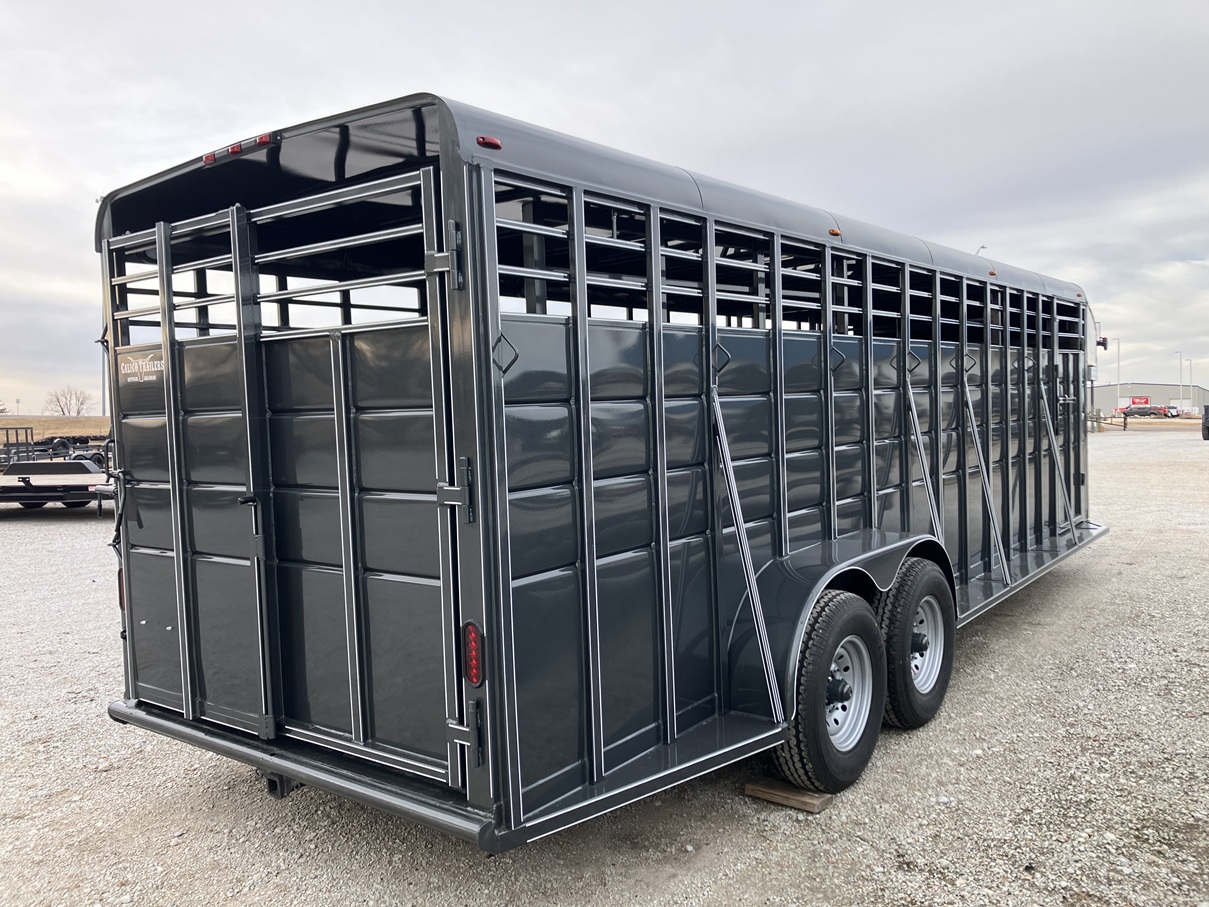 On Order - 2026 Calico Trailer MFG - 24' Gooseneck Stock Trailer - 6'8" Wide - 6'6" Tall - 7,000# Dexter Torflex Torsion Axles - Electric Brakes on Both Axles - Break Away Kit - Safety Cables - 10 Ply Radial Tires - Silver Mod Wheels - Spare Mount - Spare Included - Maxwell Aerodynamic Nose - Bull Package - 16" OC Wall and Floor Supports - LED Lights - 2-5/16" Adjustable Gooseneck Coupler - 2 Cut Gates - Full Swing Slider Rear Gate w/Locking Bull Bar - Slam Latches on All Gates - Lay Down Gate in Neck - Tie Rings- Gravel Guards in Front and over Fenders - Full Length Running Boards - Lengthways Treated Flooring - 1 Year Warranty