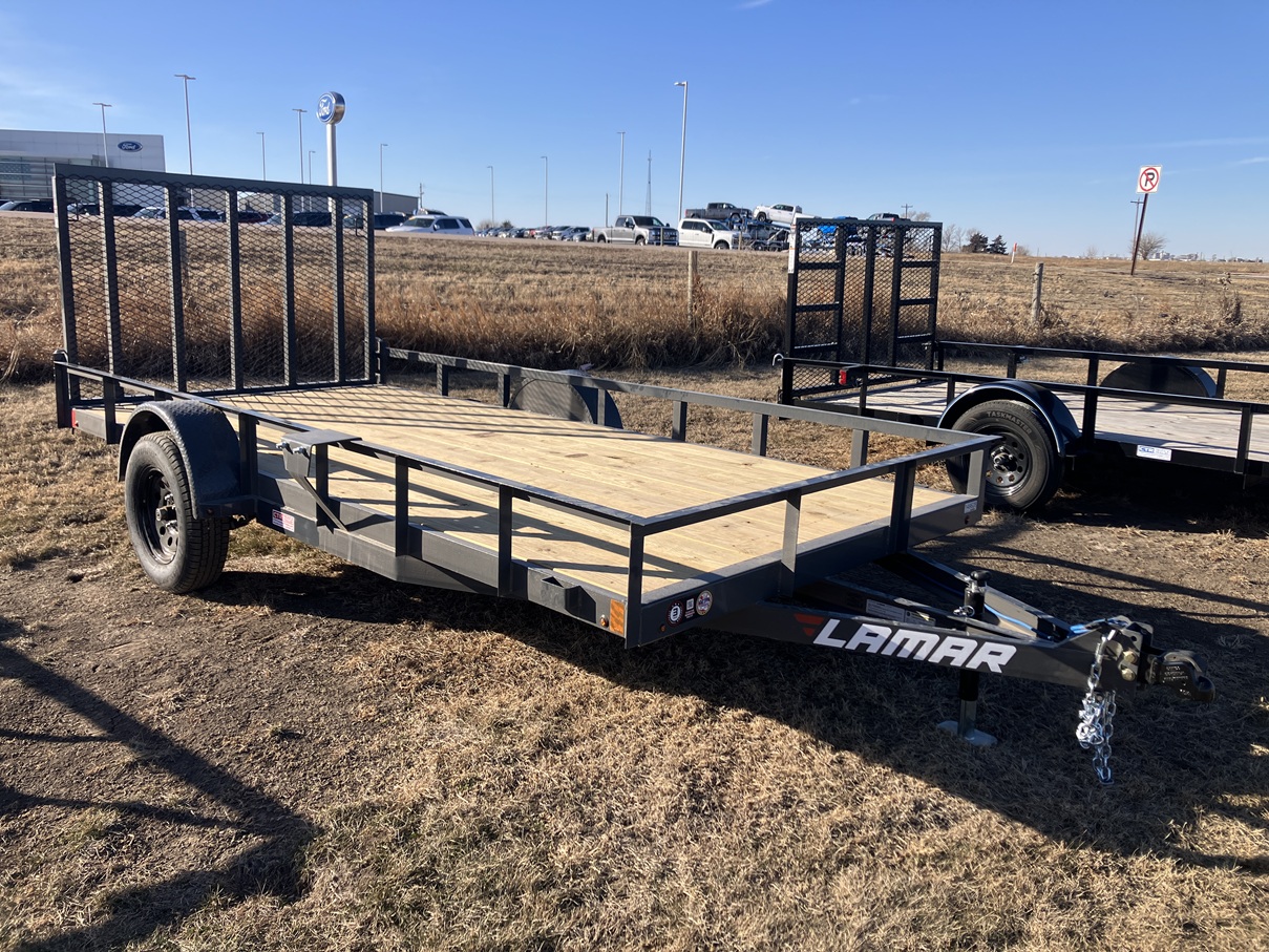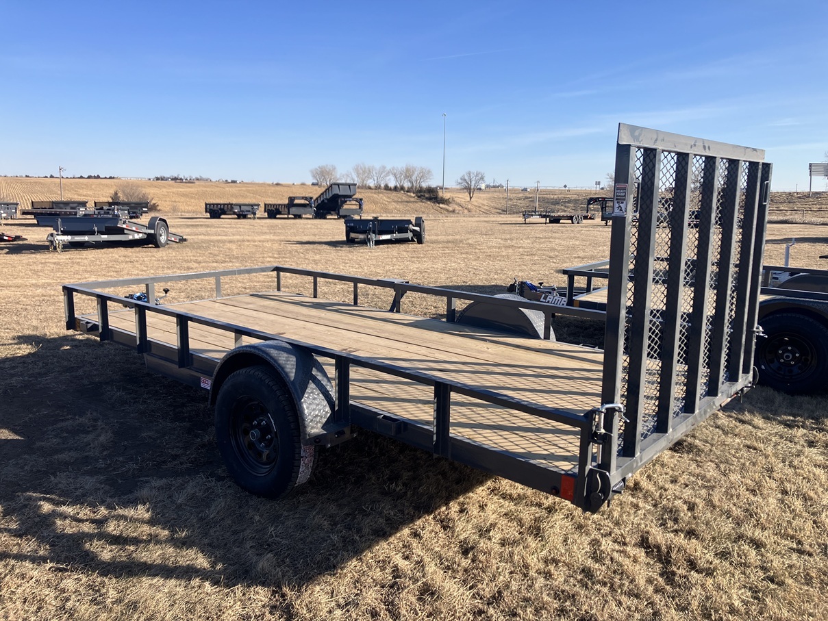 Brand New - In stock - 2026 Lamar UC 14' x 77" Single Axle Utility Trailer - 3,500# Lippert Ez-Lube Axle - 15" Black Mod Wheels - 6 Ply Radial Tires - Spare Tire Mount - Matching Spare Included - 48" Spring Assist Lay Down Ramp Gate - 4" Channel Wrap Tongue - Adjustable 2" Demco Coupler - Flip Jack - LED Lights - Safety Chains - 3 Year Structural Warranty - Financing Available
